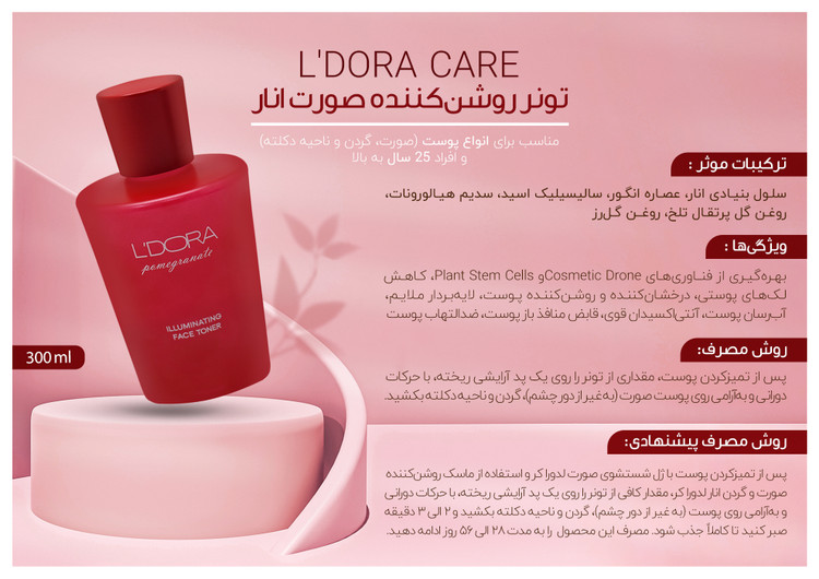 تونر روشن کننده صورت انار مناسب انواع پوست لدورا کر، 300 میلی لیتر